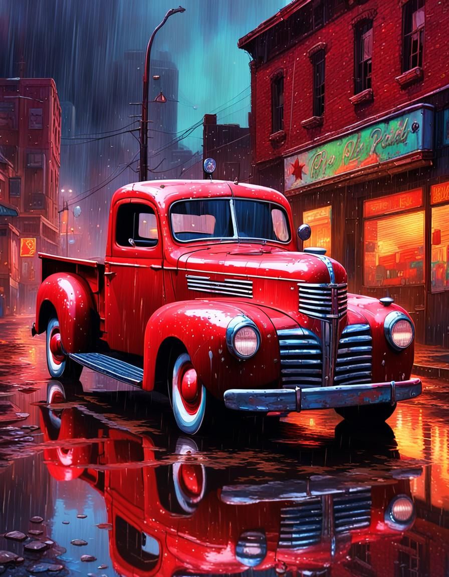 A hyperrealistic image of a vintage red pickup truck in a decaying cityscape. Rain-soaked streets reflect neon lights in this dramatic splash art style concept piece.