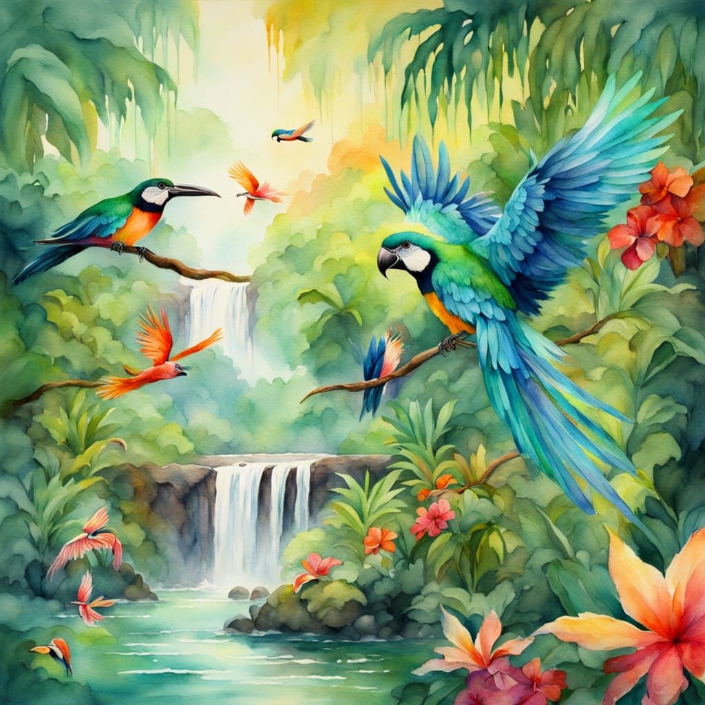 A vibrant watercolor painting of tropical birds in flight above a cascading waterfall nestled in a valley. Soft, warm light illuminates the lush foliage and detailed textures.