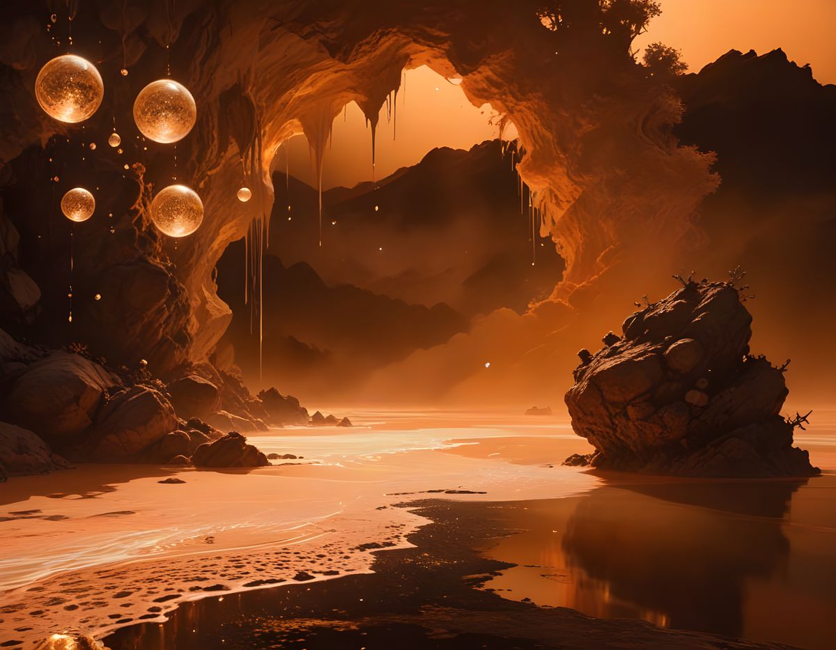 A mystical landscape painting that evokes a deep sense of being in a liminal space. The image portrays a sacred grotto, an ante-chamber between worlds, where glowing orbs of potential hang in the air. This dreamscape resonates with the current collective journey of introspection, of waiting on the threshold of a new dawn, making it a powerful piece for meditation and spiritual contemplation.