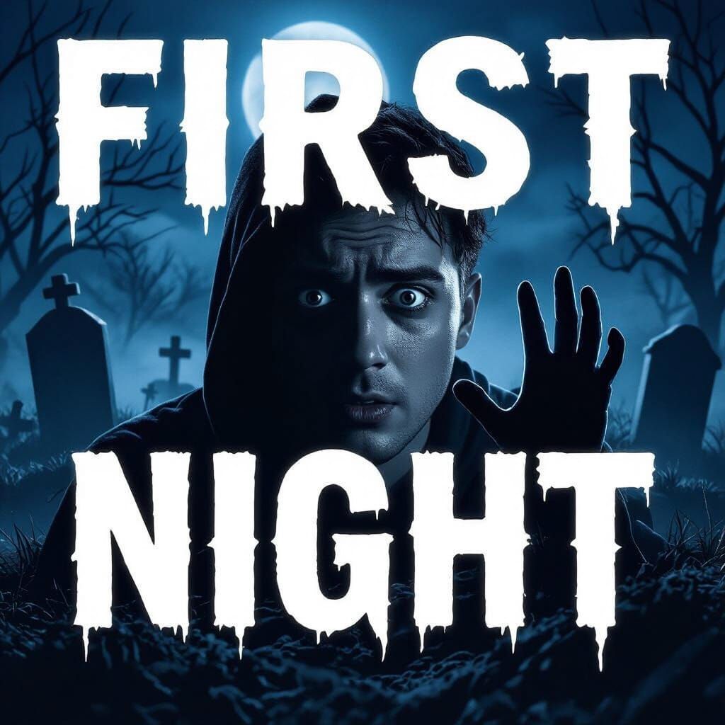 This image is a high-quality YouTube horror thumbnail. It features a dark, foggy graveyard at night under a full moon, with a frightened face and a hand emerging from a grave. The atmosphere is spooky and cinematic.
