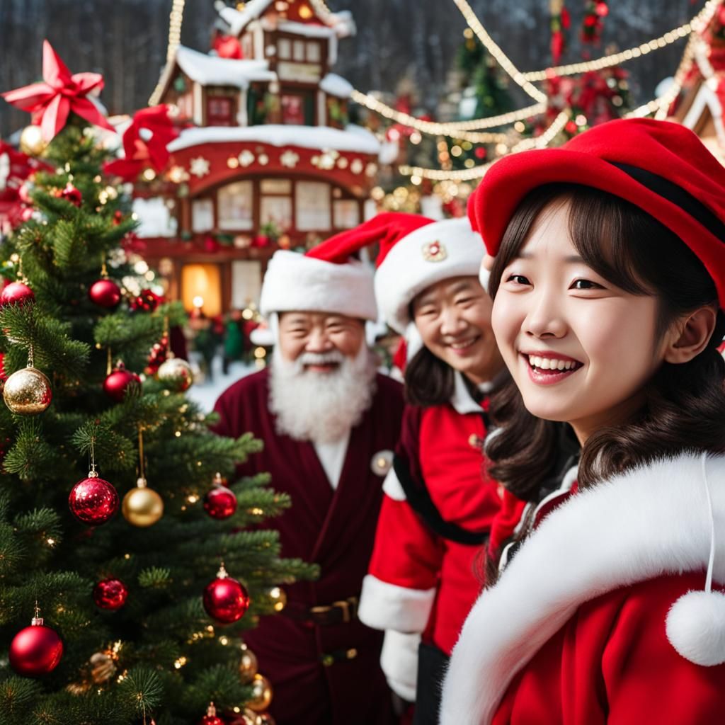 A festive village scene in Korea awaits Santa's arrival. Villagers are filled with excitement and anticipation as they celebrate the holiday season in their charming town.