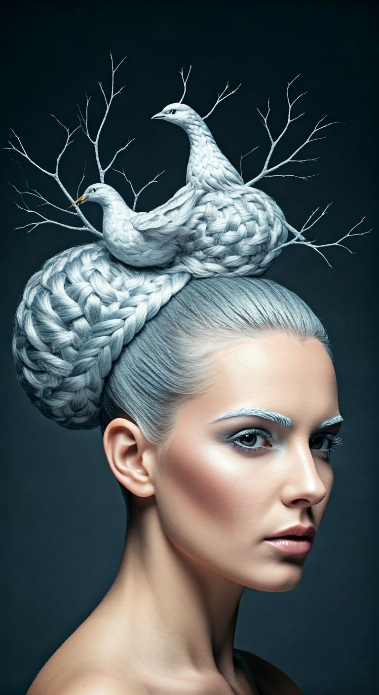 This image shows a beautiful woman with flowing silver-white hair styled into an abstract sculpture. Her hair is intricately woven and braided into the shape of a bird perched on branches.