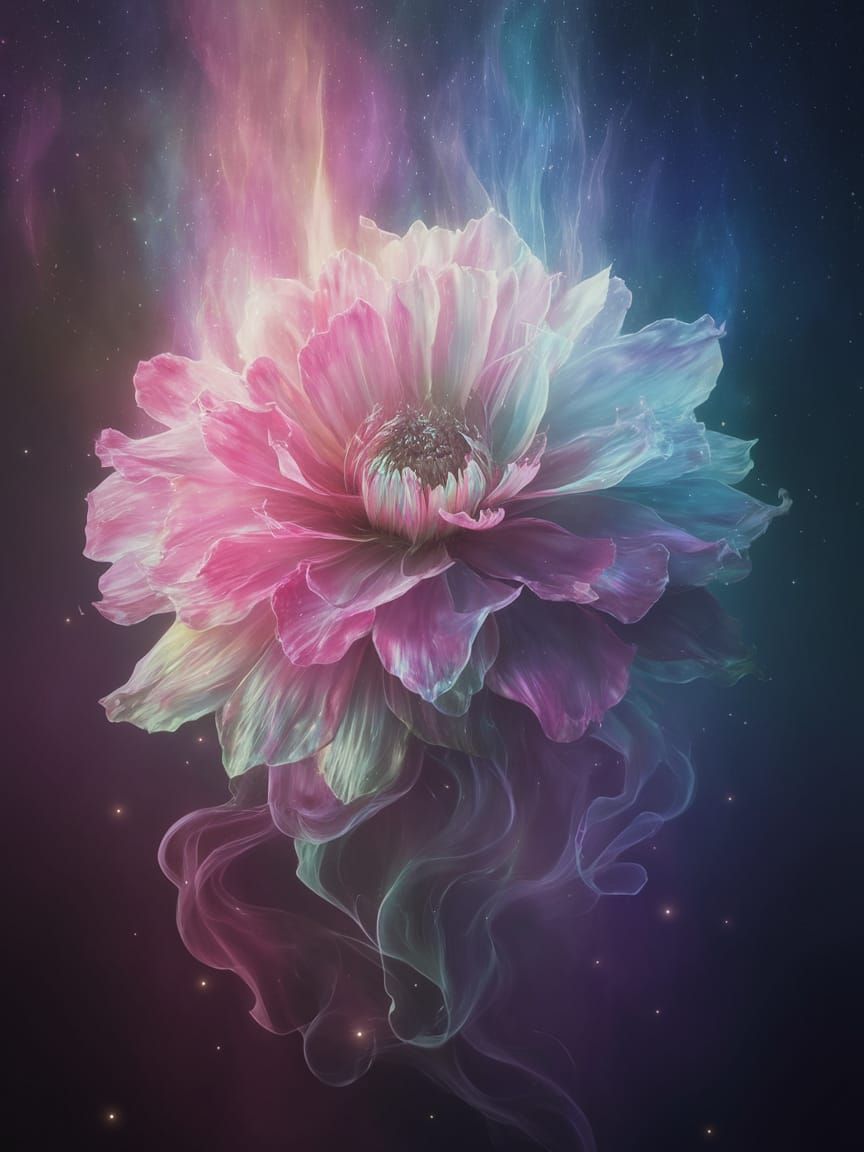 This image depicts a majestic, dreamy flower with iridescent petals and a mystical atmosphere, set against a galaxy-like background with subtle starlight and vaporous wisps.