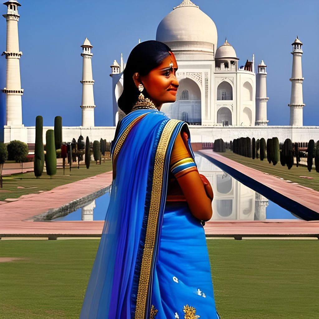 This image shows a woman in traditional Indian dress standing before the Taj Mahal. The photorealistic style captures the intricate details of both the woman's attire and the iconic monument.