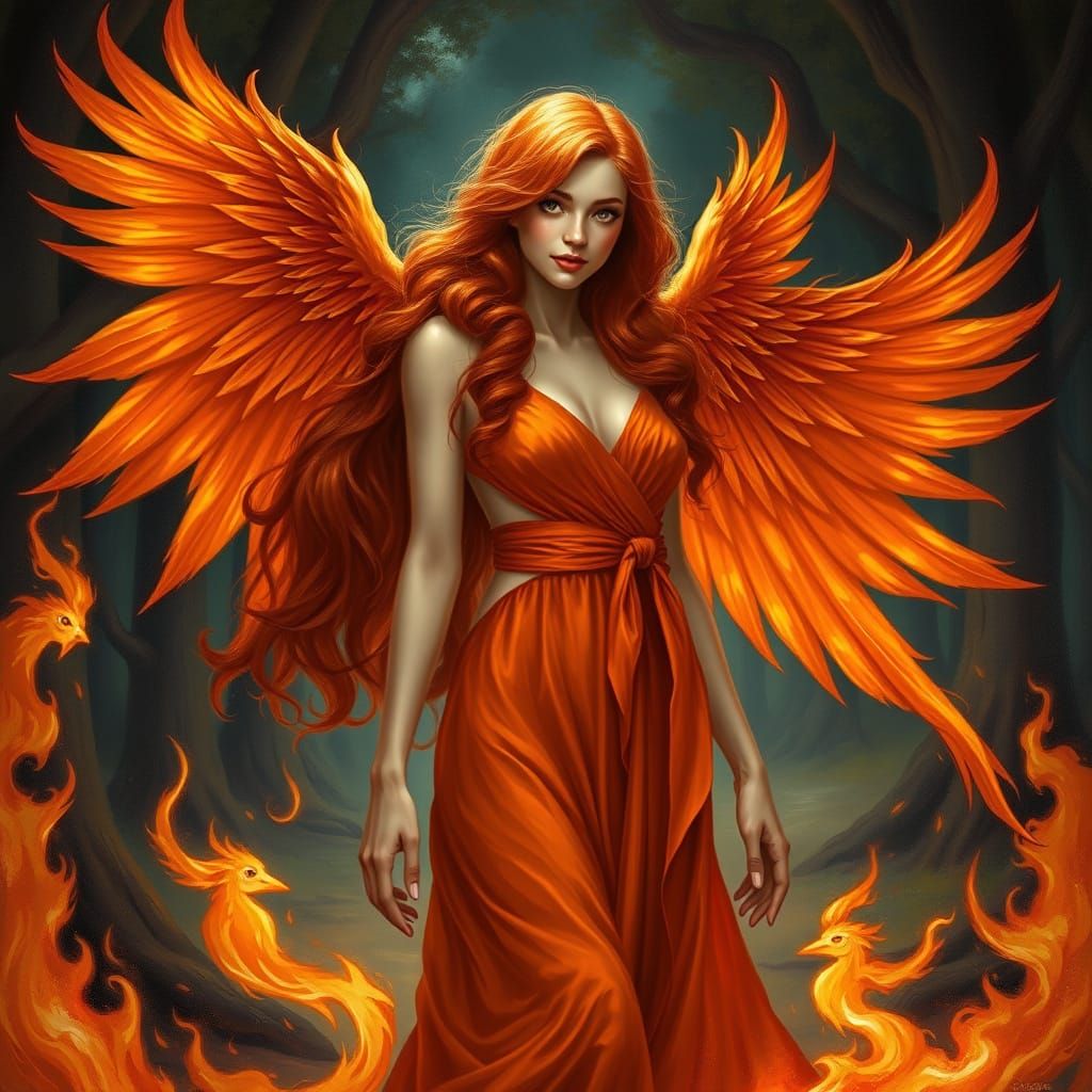 This image shows a striking red-haired woman in an orange dress adorned with phoenix wings, amidst flames on a forest floor. The digital painting features detailed lighting and a fantastical backdrop.