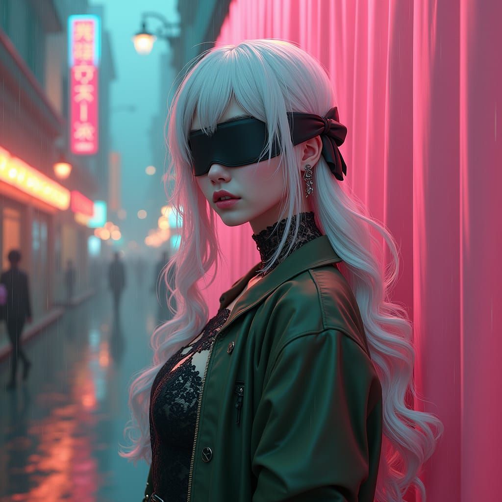 This image features a serene female character with platinum-silver hair and pink lace attire, set against a soft, rose-toned background with delicate lighting.