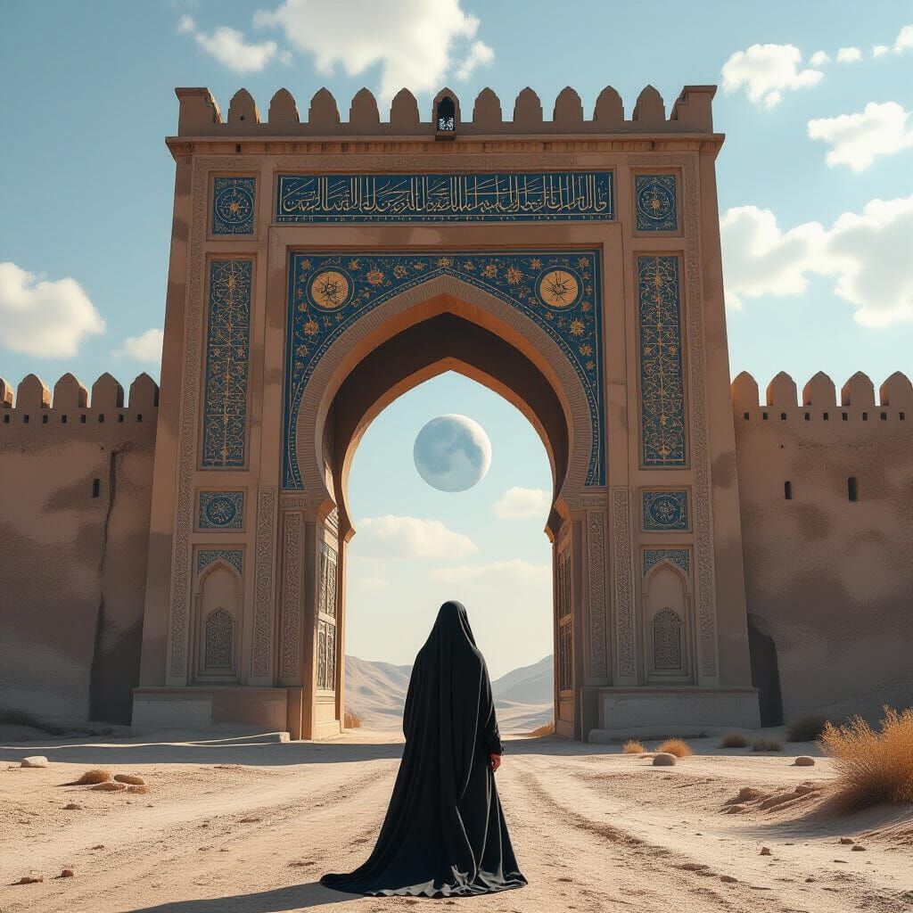 This digital matte painting shows a veiled Muslim woman in front of a vast, ancient Islamic gateway. Celestial bodies are visible through the arch. The art features high contrast lighting, evoking history and contemplation.