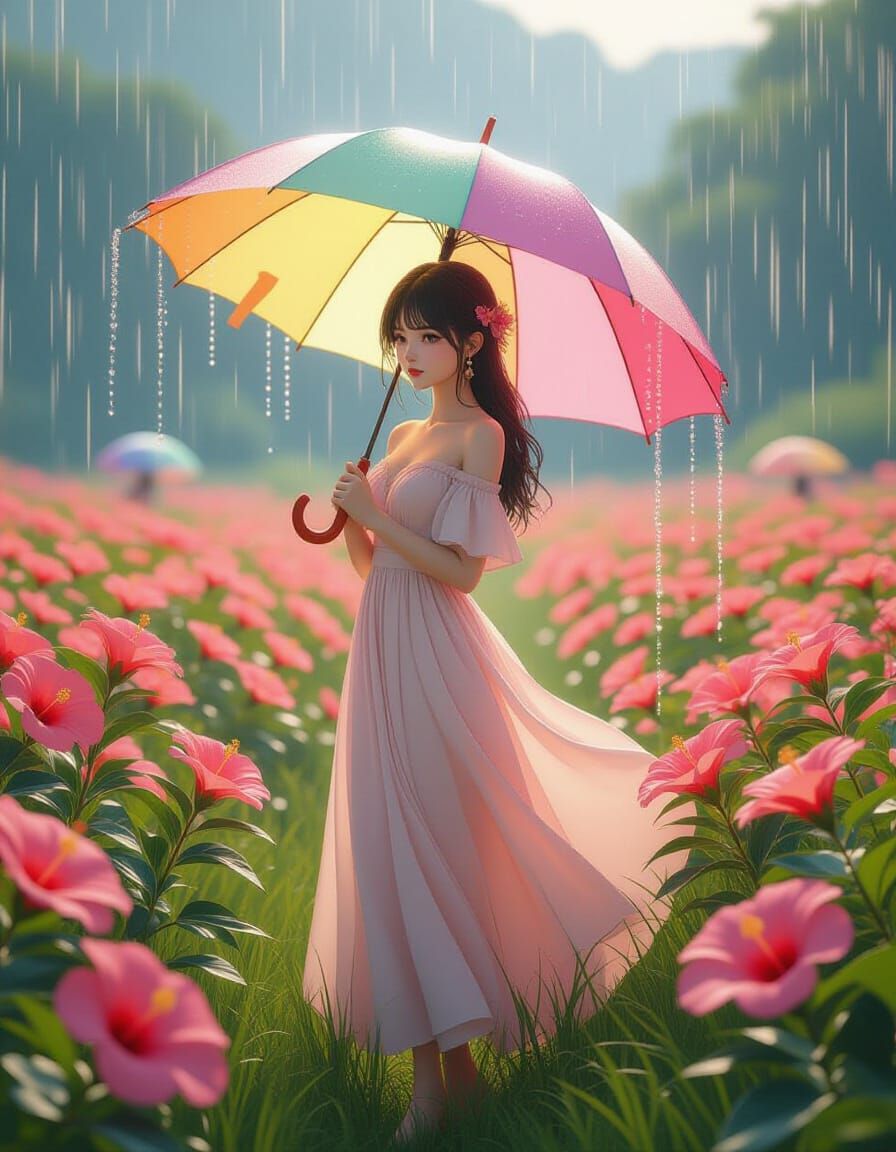 A digital painting of a woman with an umbrella in a field of flowers during a rain shower. The art blends anime and whimsical fantasy elements with rich colors and dramatic lighting.