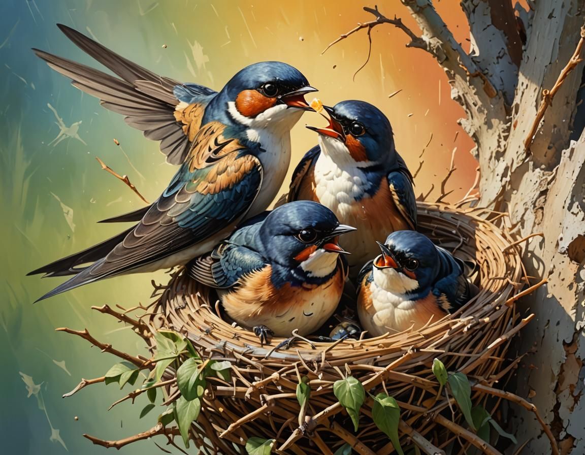 This image shows a close-up of a swallow's nest where parent birds are feeding insects to their young. The artwork has a hyperrealistic splash art aesthetic.