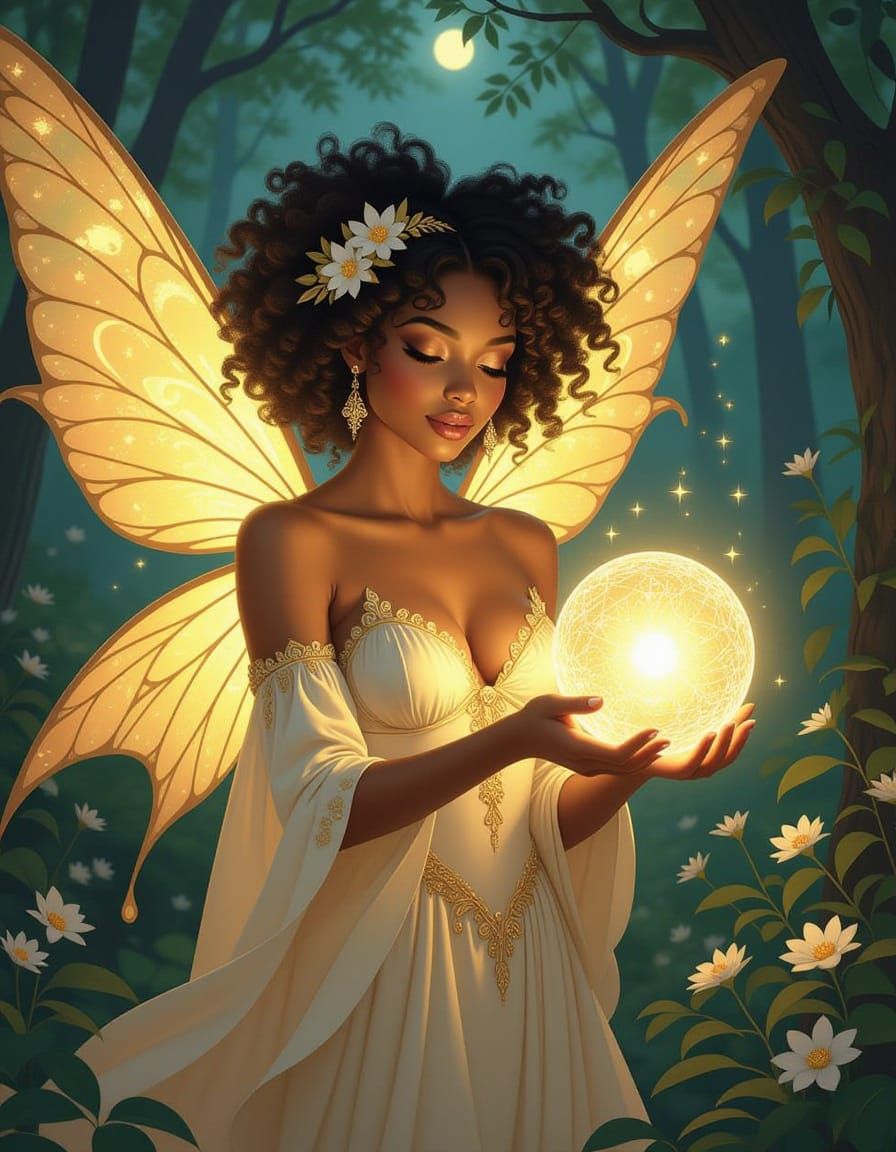 A radiant afroamerican fairy with glowing wings and golden skin holds a light orb in a mystical forest. Rendered in a romantic fantasy style with intricate floral details and a dreamlike atmosphere.