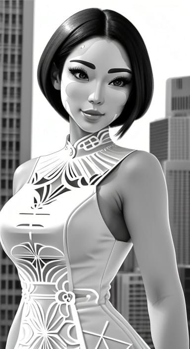 A centered minimalist line art portrait of a woman in a kirigami dress, set against a downtown Los Angeles backdrop. The artwork features delicate lines and balanced composition.