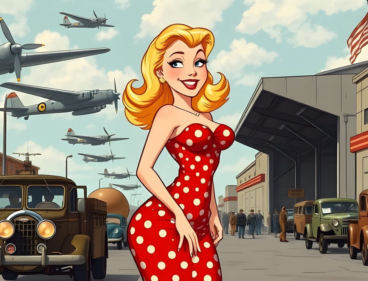 A colorful cartoon image of a smiling woman in 1940s fashion, drawn in a playful pin-up style with bold lines and bright colors, set against a military backdrop