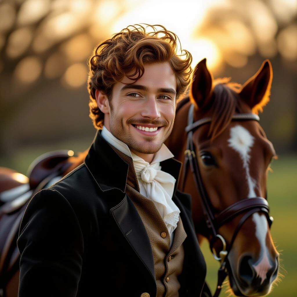 This image shows a handsome young man, Henry, smiling warmly in Regency era riding attire. He stands confidently next to a majestic horse in Hyde Park, London, bathed in soft, warm afternoon sunlight, rendered with intricate detail and vibrant colors.