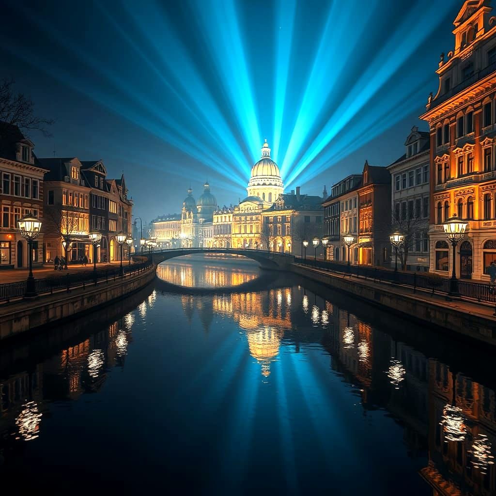 This image showcases a luminiscent canal scene reminiscent of Colmar, rendered with Unreal Engine 5.1. The artwork evokes visionary, vibrant, and magnetic qualities.