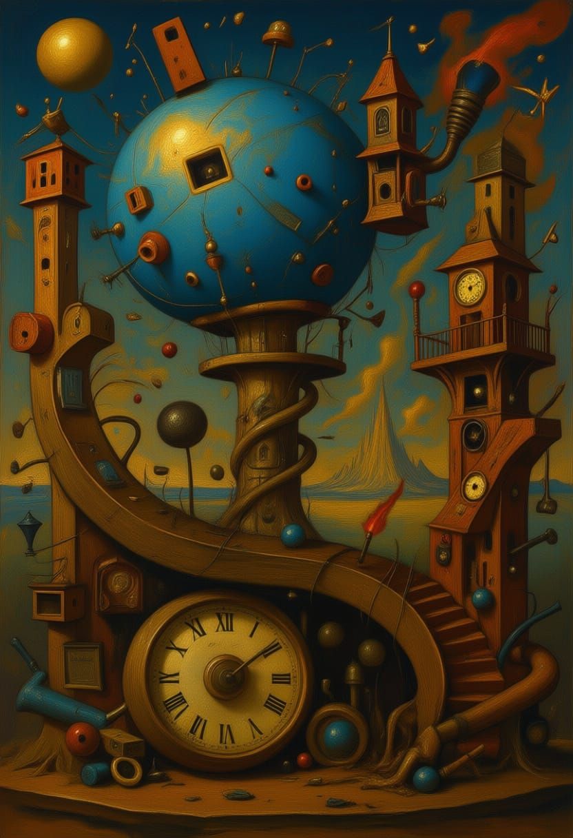 This image depicts a chaotic and whimsical scene, blending elements of dada and surrealism. It features highly detailed, abstract forms with a fantasy aesthetic.