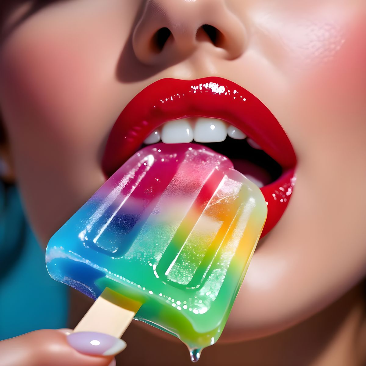 This image shows a woman's glossy lips biting a melting neon popsicle. A hyper-realistic close-up with cinematic lighting captures the vibrant colors and playful condensation droplets in ultra-photorealistic detail.