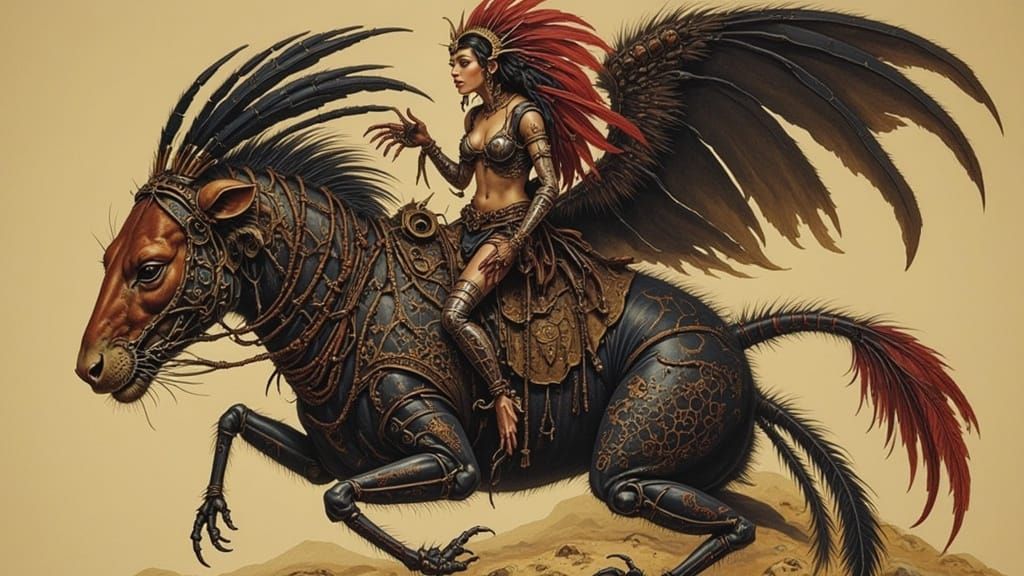 This image showcases a tribal woman in leather armor and a feathered headdress riding an elasmotherium. The artwork features a dynamic, high-contrast aesthetic.