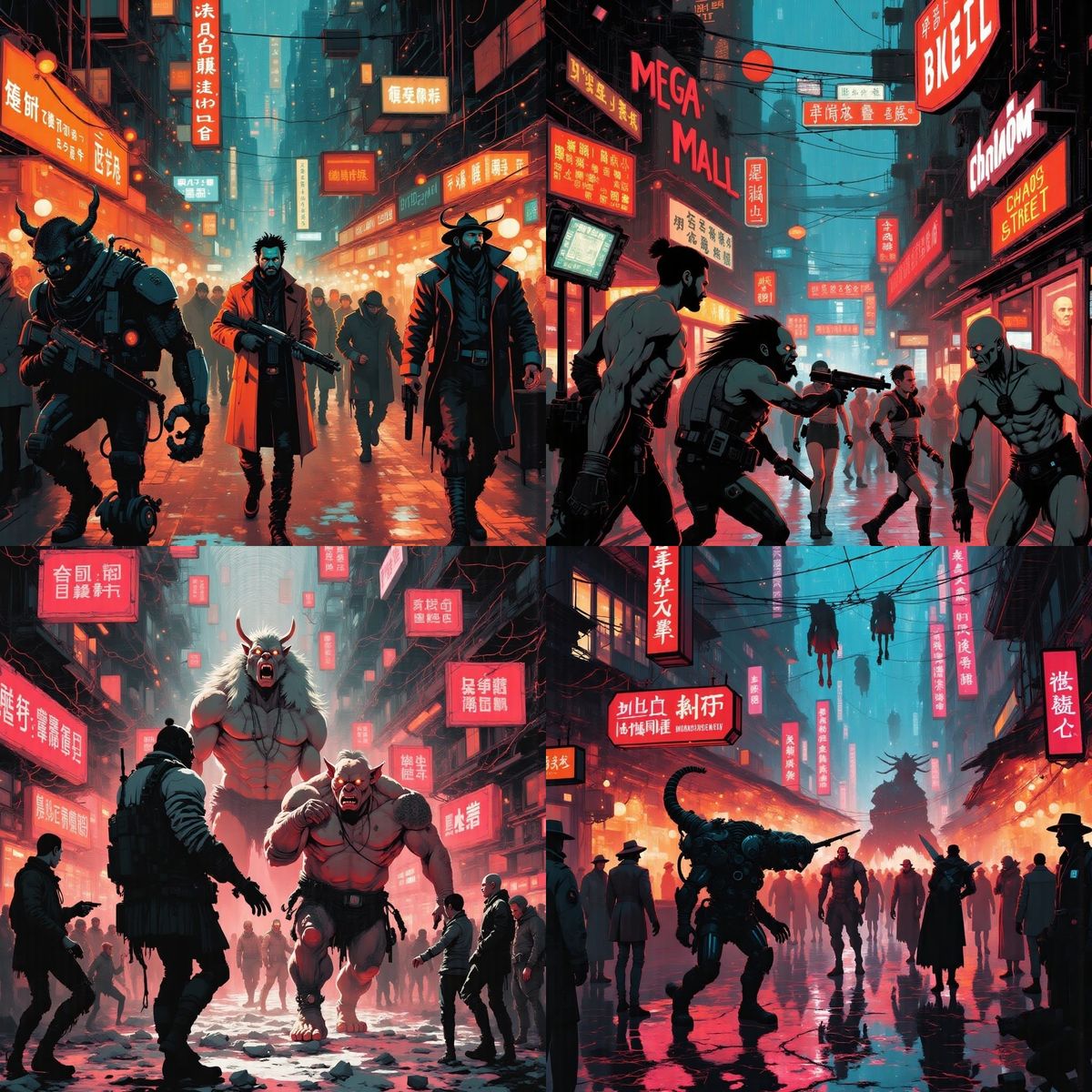 This image shows a chaotic battle in a cyberpunk marketplace. Humans, cyborgs, orcs, and trolls clash amidst neon signs. The scene is rendered as a dynamic fantasy illustration with bold lines and strong contrast.