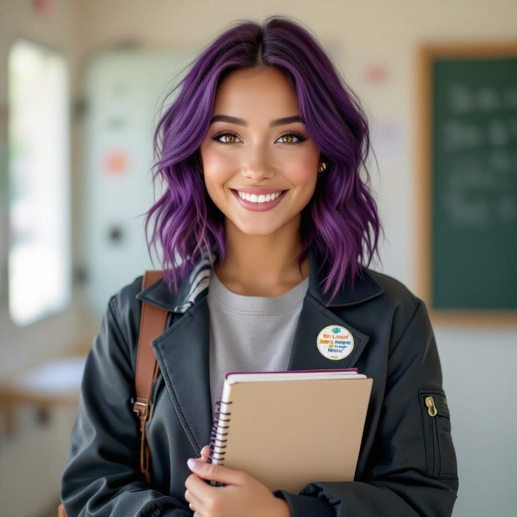 A realistic portrait of a confident young woman with purple hair holding a notebook. She wears a school jacket and a badge against a blurred school background, rendered with detailed textures.