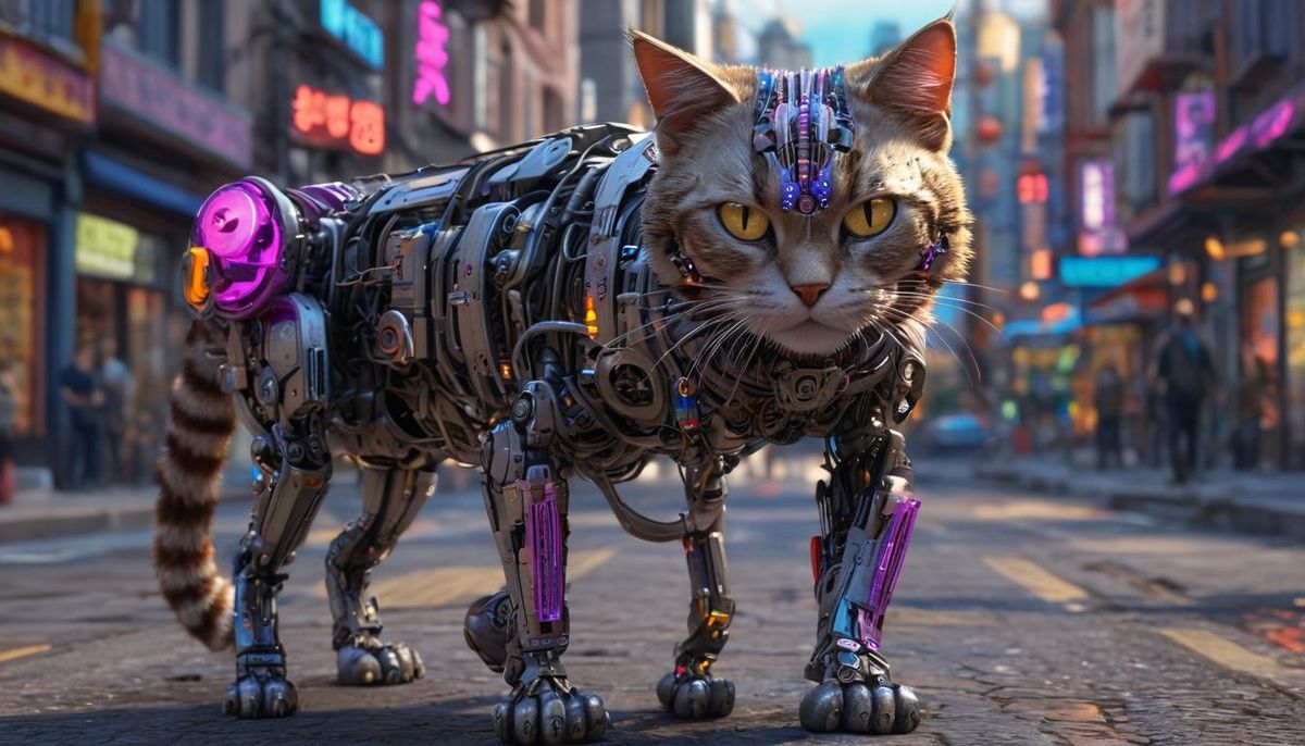 This image features a detailed cyborg cat with mechanical parts in a vibrant, neon-lit futuristic city street. Created with psychedelic art influences and HDR, it's a detailed masterpiece.