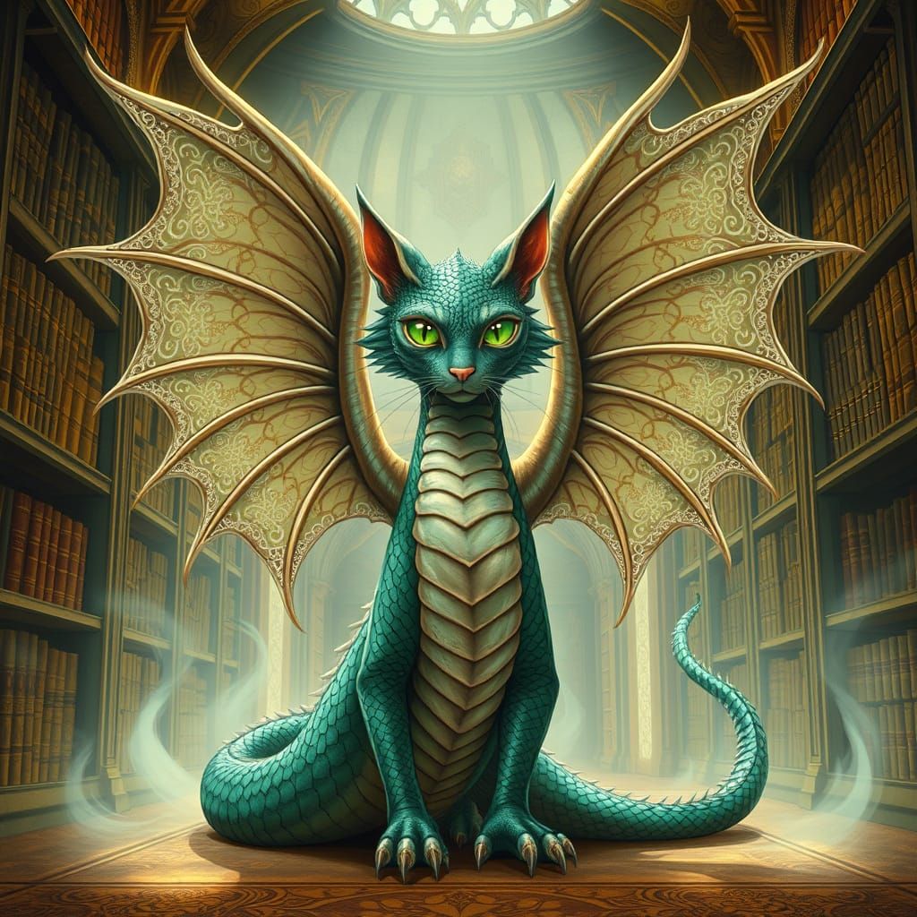 This image shows a fantastical creature with the body of a dragon, head of a cat, and angelic wings guarding a grand library with intricate details and a whimsical, dreamlike quality reminiscent of Hayao Miyazaki's style.