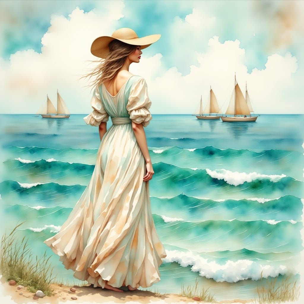 A serene woman stands at the edge of a tranquil turquoise ocean, gazing out at the horizon where soft clouds meet the gentle waves, with sailboats drifting lazily in the distance, in a delicate, whimsical watercolor aesthetic