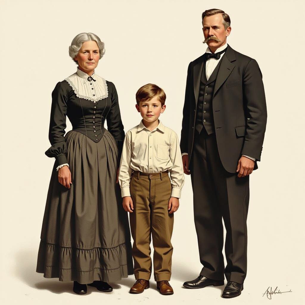 This image shows young Thomas Edison between his mother and a schoolmaster. Rendered with realistic detail and soft shadows, the style recalls late 19th-century historical illustrations.
