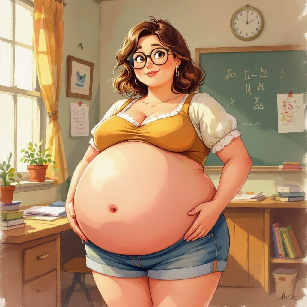 This image features a shy teacher with glasses, large bra, and shorts, possessing a significantly large belly. Rendered in a vibrant watercolor style with bold brushstrokes and warm colors, it evokes gentle humor and vulnerability.
