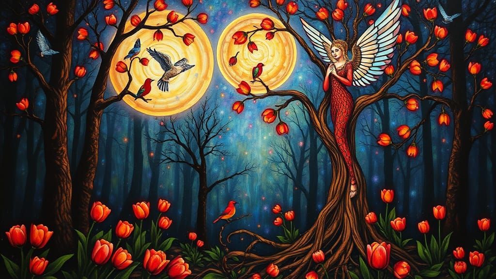 A vibrant, maximalist artwork depicting a psychedelic utopia. The image features a goddess figure emerging from a dark forest, with trees crafted from stained glass and swirling nebulae in the sky, in the style of an oil painting.