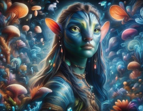 This image features a Na'vi portrait rendered with a chalk texture and bold strokes, set against a fantasy landscape with glowing blue mushrooms and fireflies. The art style is vibrant and features deep saturation.