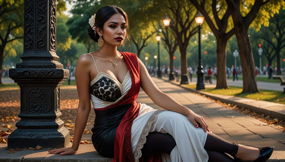 This image shows a striking photorealistic portrait of a gorgeous Mexican woman in a vibrant saree and gothic stockings, sitting in a park. The image features intricate details, soft lighting, and lush surroundings.