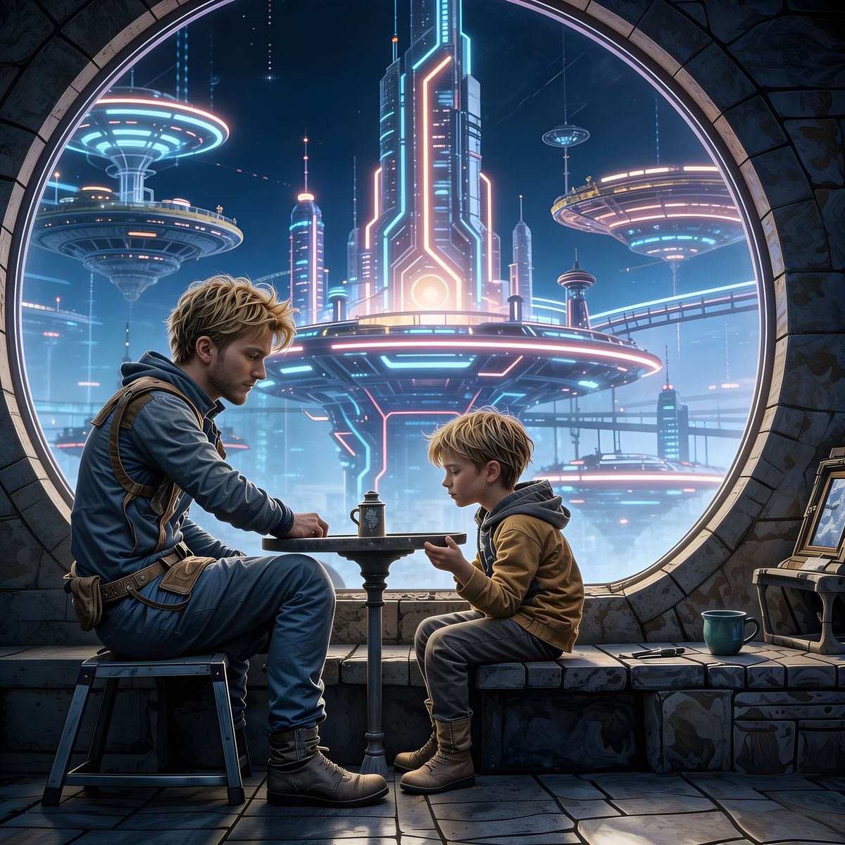 A thoughtful image of a young father and son looking out a window at an alien city. The scene conveys quiet introspection and a sense of worry, rendered in detailed fantasy concept art with graphic linework.
