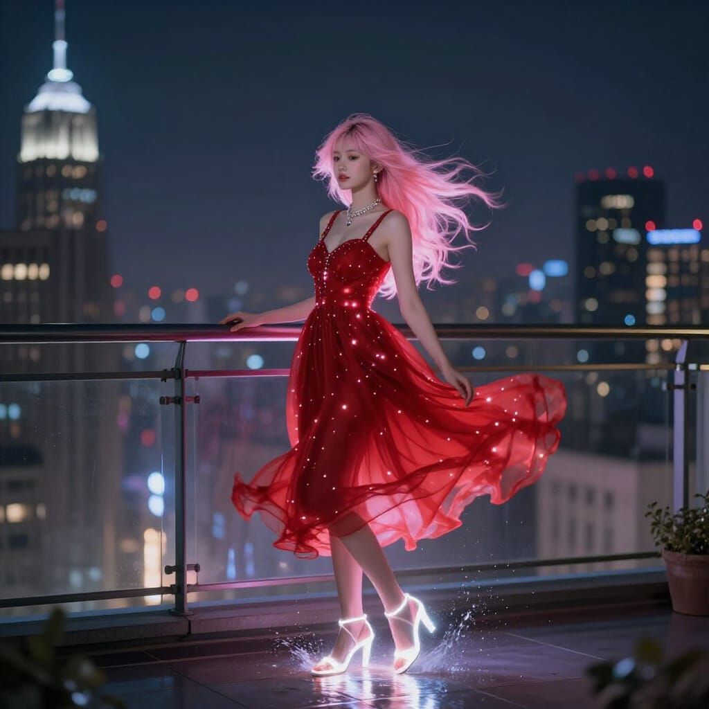 This image shows a hyperdetailed fantasy scene of a woman with pink hair in a glowing red dress and heels on a misty penthouse balcony at night, rendered in an ethereal style.