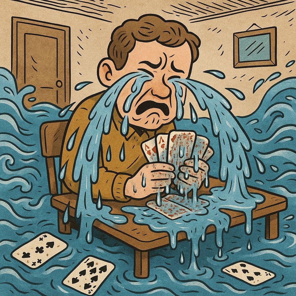 This image depicts a man overwhelmed with grief at a card table, his tears flooding the room and soaking the playing cards, symbolizing a devastating loss.