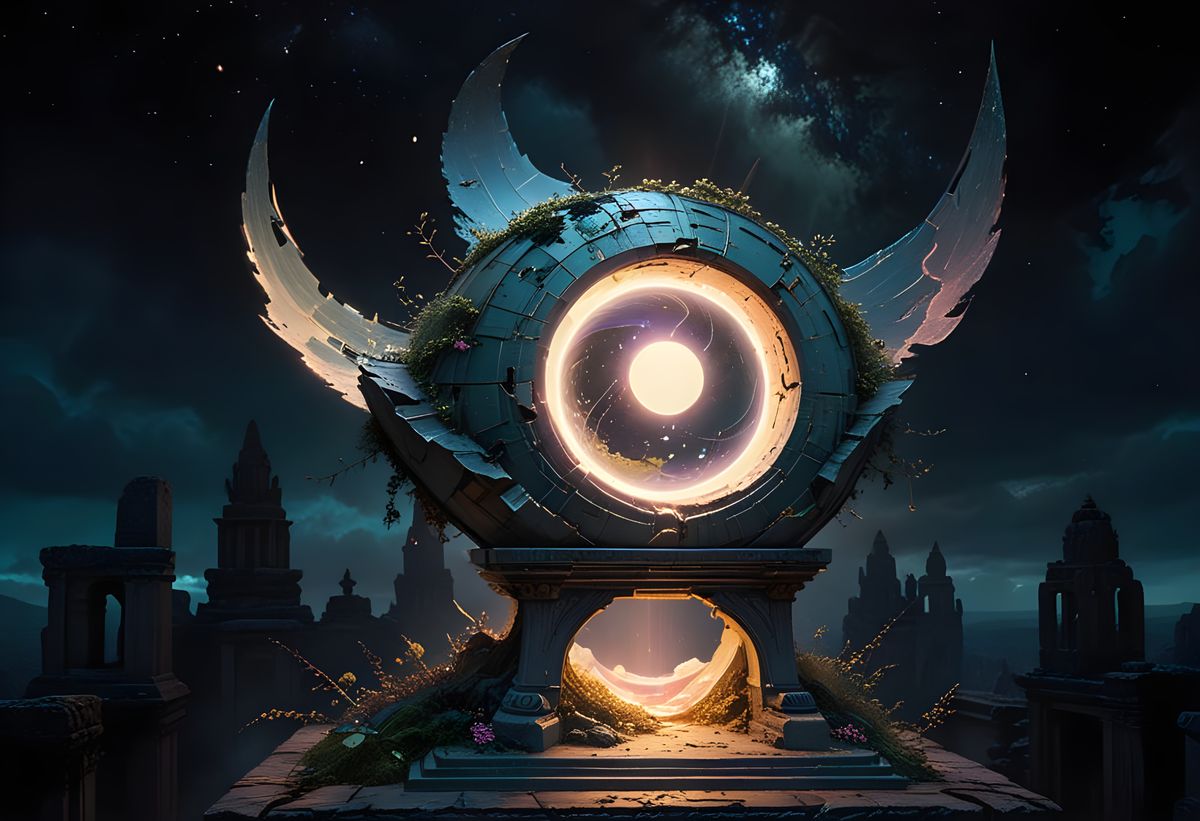 This image shows a cracked obsidian egg releasing a universe of data points in a ruined temple courtyard. Features crepuscular rays and an ethereal color palette.