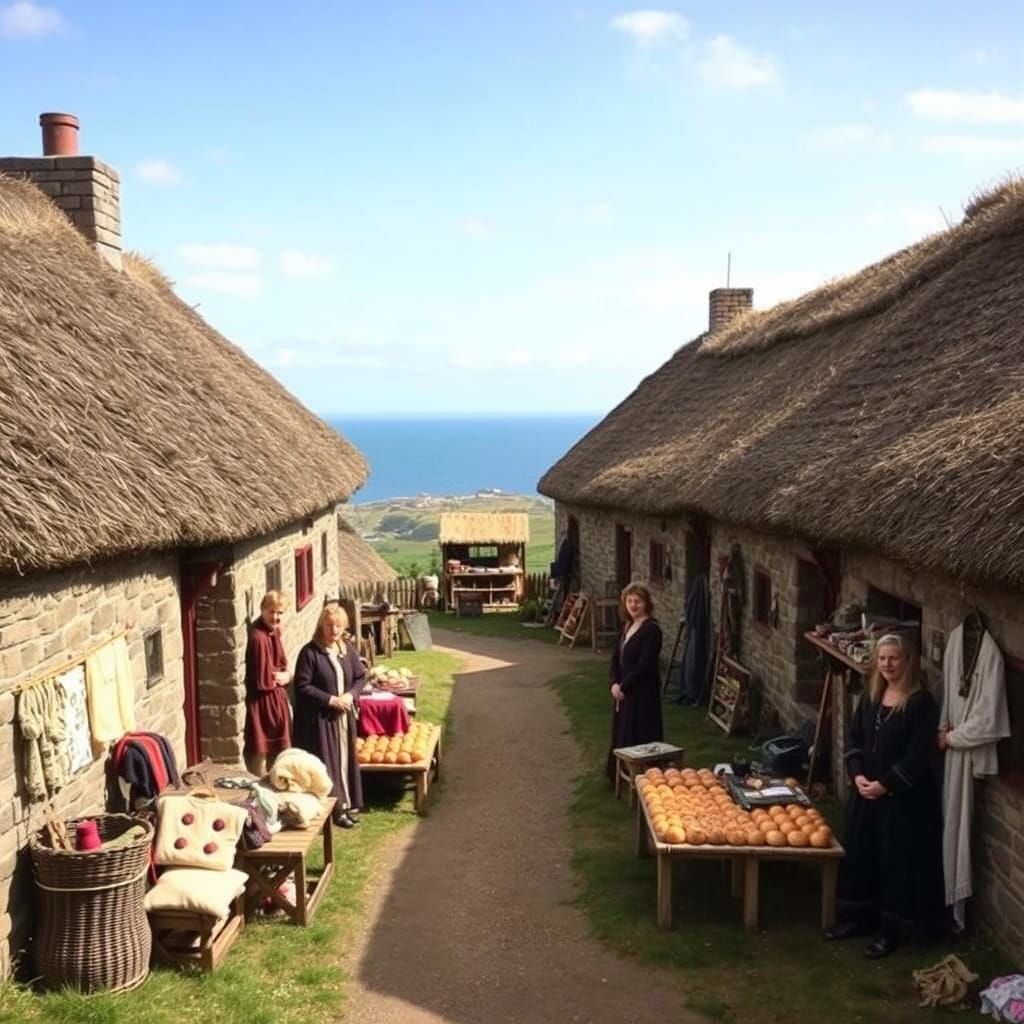 A quaint croft village of stone houses with thatched roofs sits overlooking the North Sea. Villagers in 17th-century attire display crafts and baked goods.