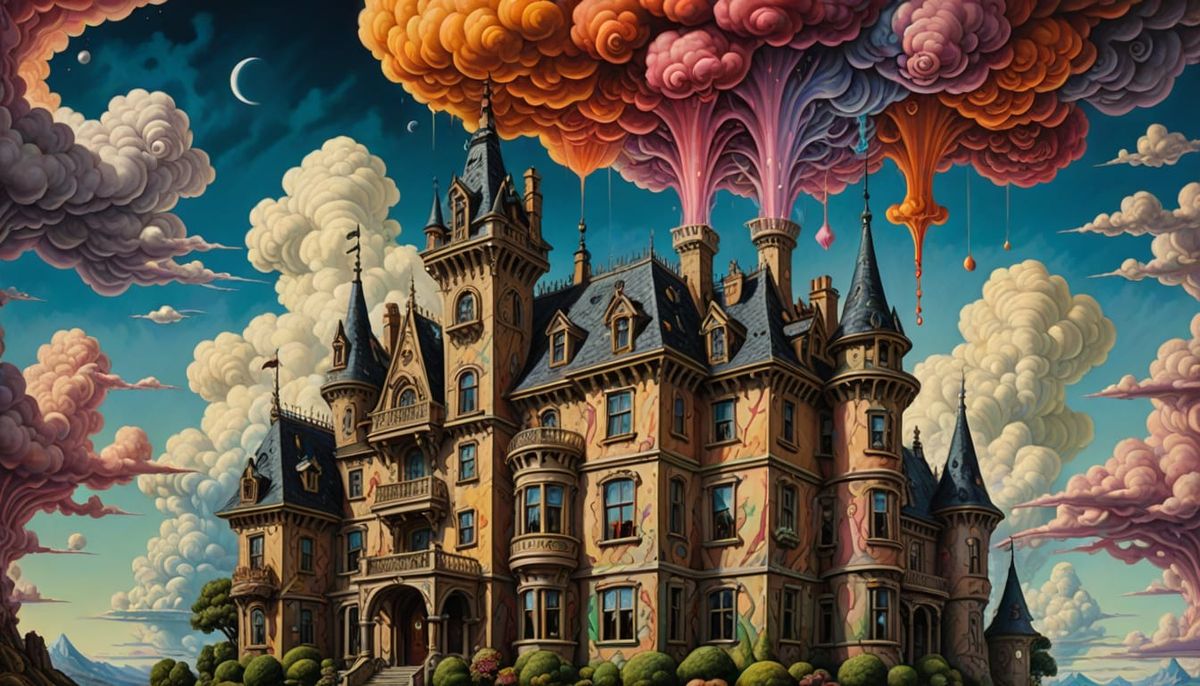 This vibrant digital painting captures a dreamlike castle in a close-up portrait shot, with melting walls and swirling clouds in a style reminiscent of Lowbrow art and Surrealism.