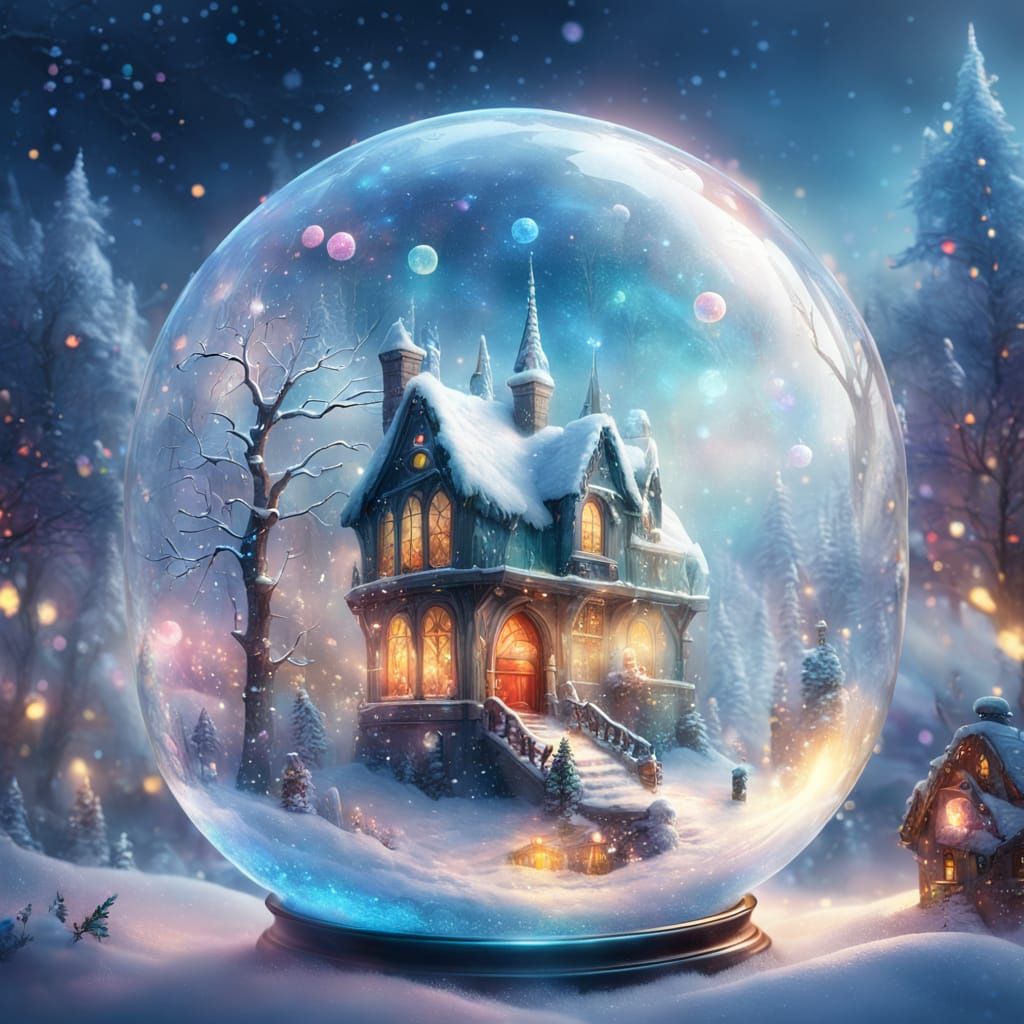 This image shows a detailed glass bubble containing a magical winter landscape illuminated by colorful fairy lights, rendered in a hyperdetailed fantasy concept art style with complementary colors.