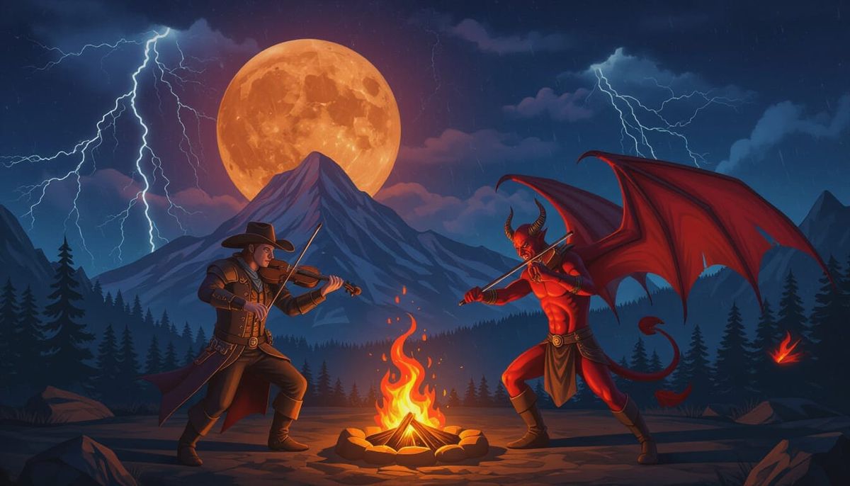 Background Red moon electric thunderstorm fire on a mountain In front of that is a wings cowboy playing a fiddle looking flaming sword again...