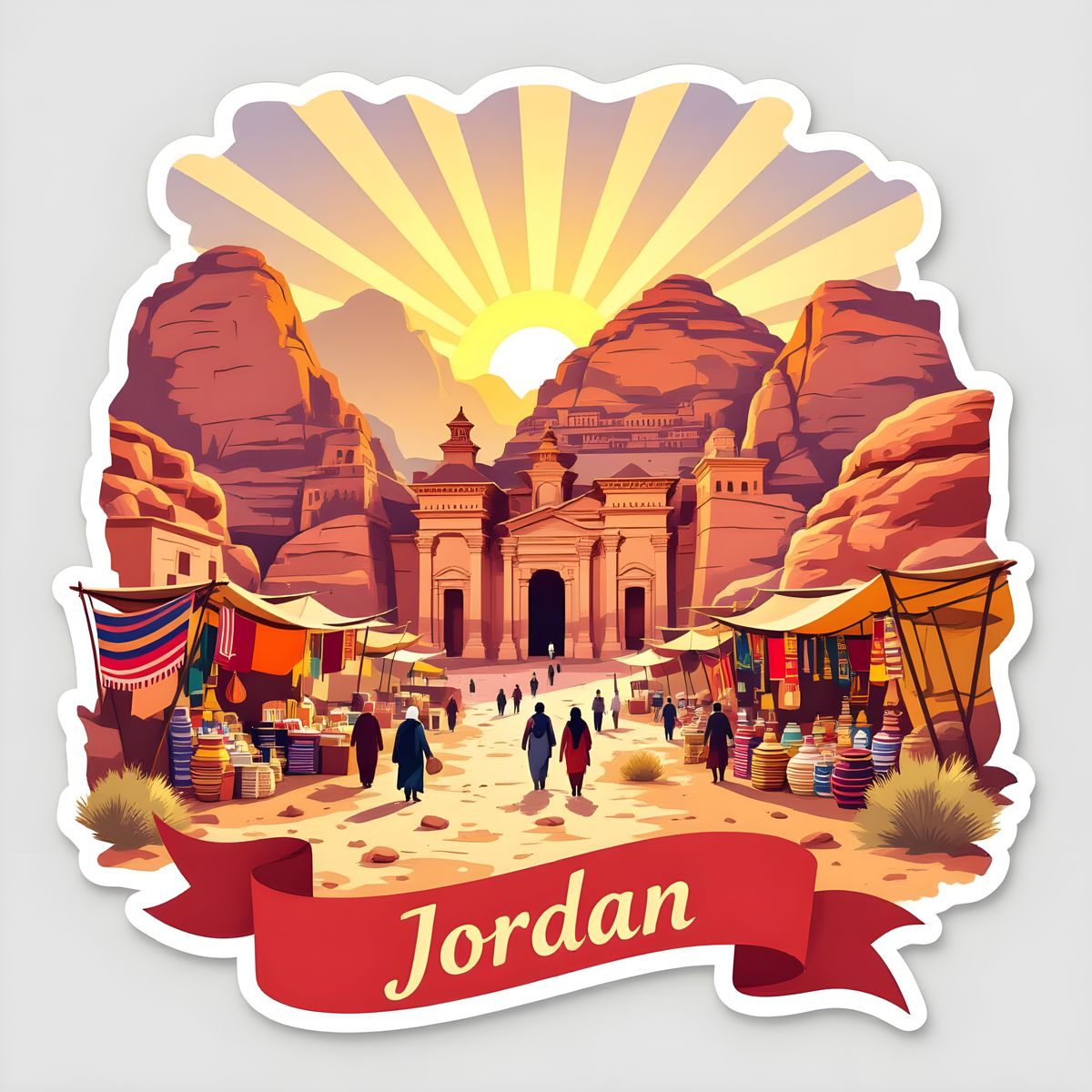 This image shows a vibrant travel sticker featuring the ancient city of Petra in Jordan. It depicts the rose-red facade, market stalls, and a sandy path under warm sunlight, evoking a sense of adventure and discovery.