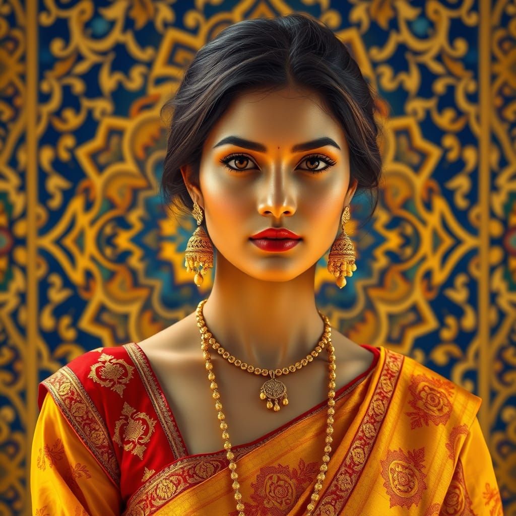 This image features a serene woman in a luxurious golden yellow and red sari, adorned with intricate patterns and gold accents. She wears elegant gold jewelry and stands in a symmetrical blue and gold mosaic tile background, exuding a sense of ethnic fashion and cultural sophistication.