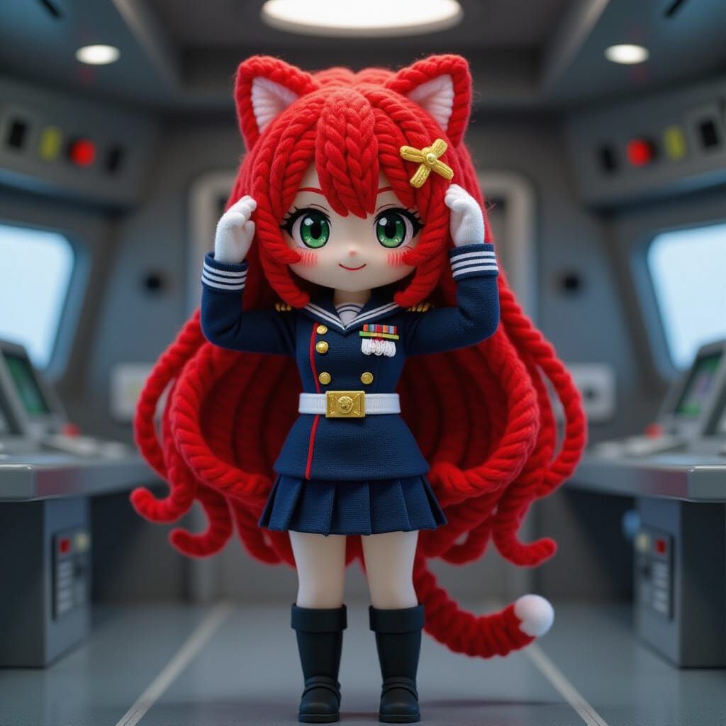 A striking picture of a young cat-woman rear admiral with long red yarn hair, wearing a detailed space navy uniform and saluting on a starship bridge. This 3D composition resembles a kawaii anime character.