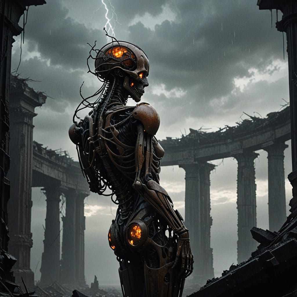 This image depicts a vast, desolate landscape with giant corroded iron walls. Anatomical forms, broken equipment, and seashells are scattered among cracked Roman columns, under a stormy, eerie glow. Features Gigeresque biomechanical textures and dramatic chiaroscuro lighting.