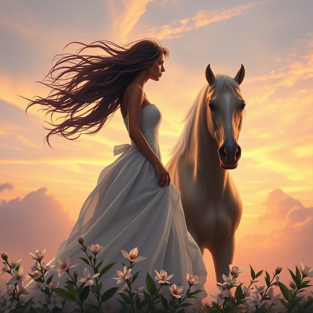 This image shows a romantic, whimsical scene of a woman and horse silhouetted against a breathtaking, dreamy sky with soft pastel hues. Delicate white flowers bloom at the bottom, adding subtle contrast to the intricate details of the scene.