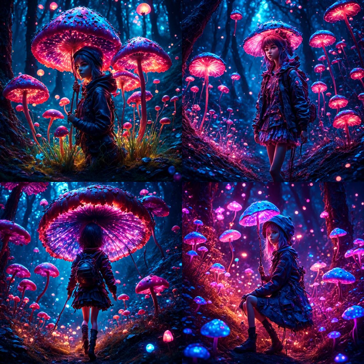 This image shows a whimsical anime-style illustration of anthropomorphic onion grass and mushrooms skipping through a neon-lit forest. The artwork features intricate details and a vibrant color palette, reminiscent of 3D digital art.