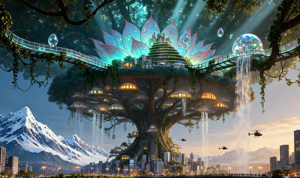 This image showcases a massive world-tree integrating with modern cities and natural canyons. Bioluminescent flowers and terraced cities bloom in its canopy, rendered in a hyper-detailed, cinematic style with rich lighting.