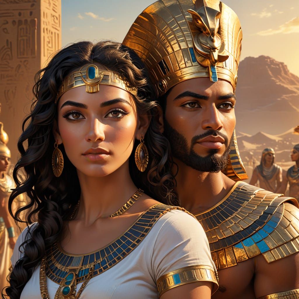 A striking picture of Isis and Osiris in an embrace. This vibrant mythological illustration shows the divine couple illuminated by warm sunlight. The art is reminiscent of ancient Egyptian paintings.