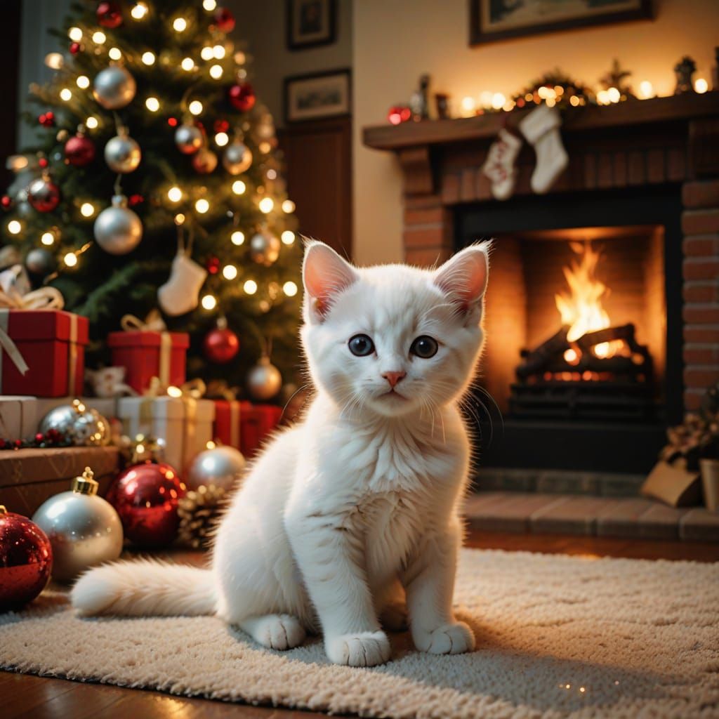 This image captures a heartwarming Christmas Eve scene. A white kitten sits by a fireplace amidst festive decorations, with a family enjoying the cozy, warm lighting and twinkling fairy lights.
