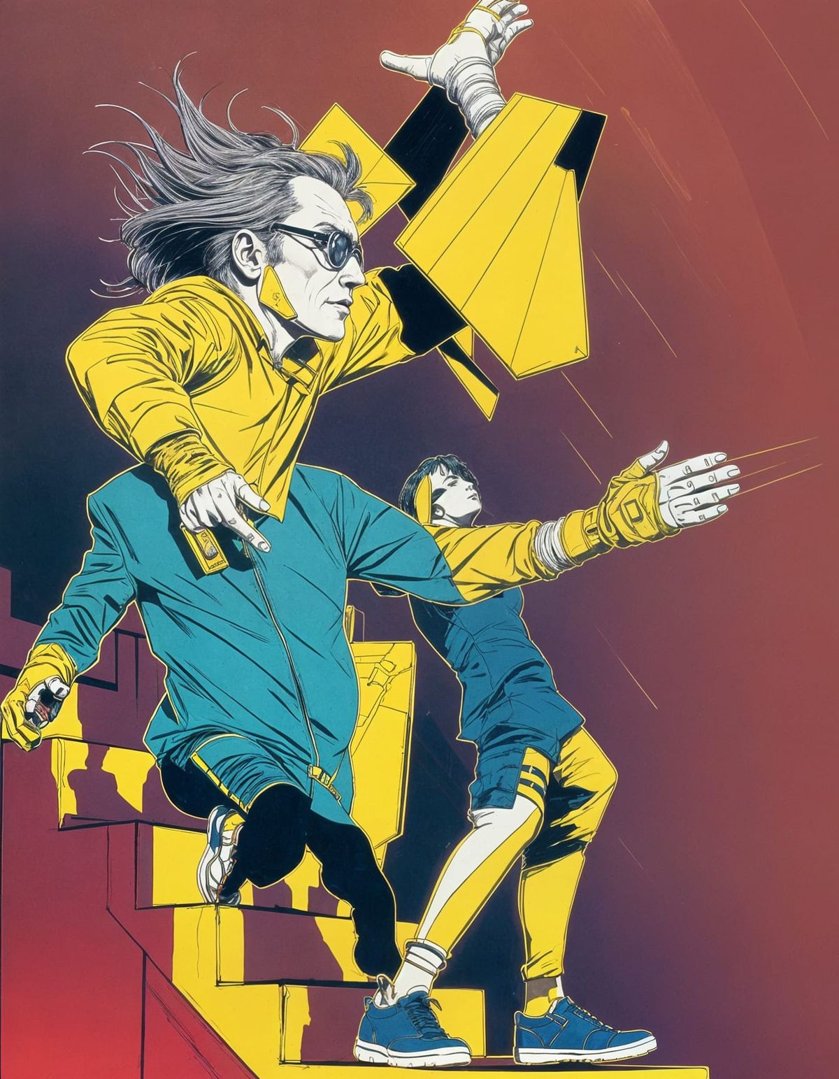 This image shows a mythical creature ascending a staircase clinging to the worn edges. The artwork features a blend of geometric, futuristic, and scientific illustration styles with tetradic colors.