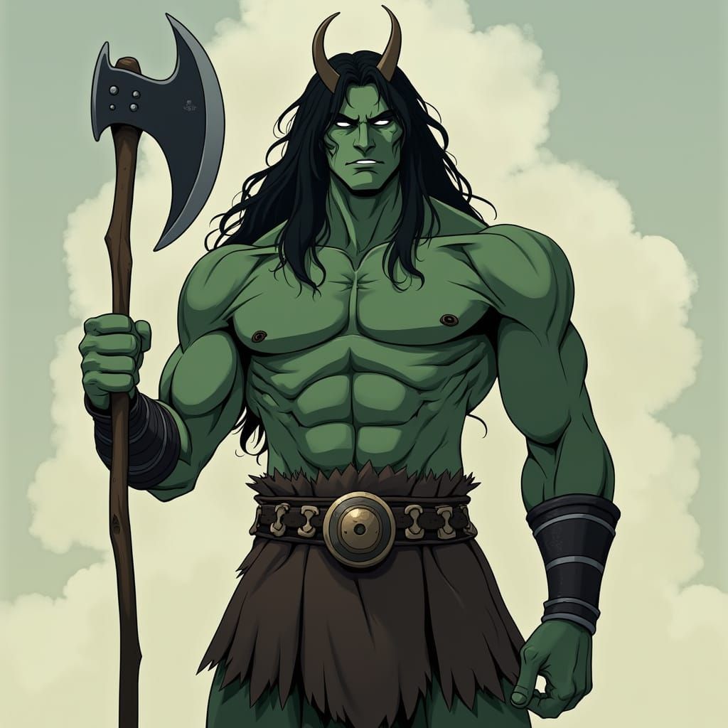 This image depicts a tall, incredibly muscular man with long black hair and dark green skin, sporting viking attire and carrying a large axe. Rendered in a vibrant, cel-shaded anime style with cinematic lighting.